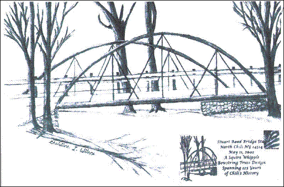 4.     In western New York, Gregory Clyde, the Chairman of the Stuart Road Bridge Sign Committee of Chili Mills sent us the corrected text for the plaque at will appear on the Stuart Road Bowstring that was restored by Monroe County DOT in 2002. (See the PRESERVATION section)  It will read: