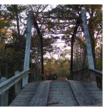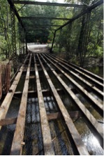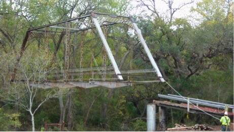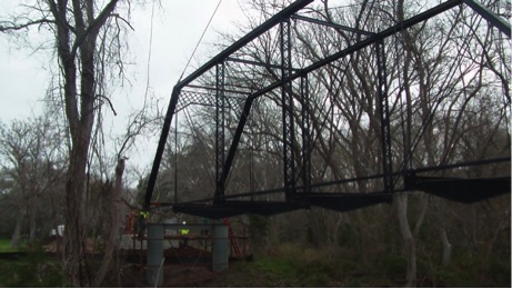 The Piano Bridge, a Pratt truss built by the King Bridge Company in 1885. was rehabilitated in 2012 thanks to the combined efforts of the Texas DOT, local enthusiasts and a group of local contractors who removed the bridge from its piers, undertook an extensive refurbishing of the iron work and flooring, then lifting it back in place across the East Navidad River . All this work took place at the bridge site and it is has now been reopened for vehicular traffic.. This work was documented by “pontist” Julie Bowers of “Workin Bridges”. This bridge has been a local landmark for some time. Wedding parties have used the bridge as a site for memorable photos.