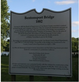 “There are several extremely rare and significant pin-connected truss bridges on the lower section of the Des Moines River. Each are distinguished as rare surviving examples of large, multi-span examples of their type. Among them, the Bentonsport Bridge stands out as a large, relatively complete, and early example. The bridge is a long, five-span truss bridge. Each span contains eight panels. One of the central spans was replaced after it was damaged in a flood in 1903. The span was replaced by the George E. King Bridge Company of Des Moines, Iowa, which was a spinoff of the King Bridge Company who built the original bridge.”